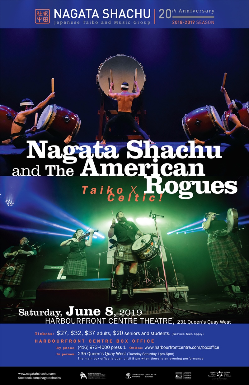 Leader of The American Rogues, Hamilton’s Nelson Stewart states, “The American Rogues are extremely honoured to be performing with Nagata Shachu. I have long been drawn to Japanese culture; I studied Japanese history, the band performed in Japan, and my wife and I, fellow American Rogue Jeania Stewart, studied taiko under Nagata Shachu member Tony Nguyen. I was thrilled when Kiyoshi agreed to our two bands working together. As it turns out, we had both seen each other’s episodes in the ‘Sounds of Canada’ series, and, believing that the same heart beats within the music of both Japanese and Celtic culture – it was a match made in heaven. The American Rogues hope that this will be the first show in a partnership that will continue for many years to come.”