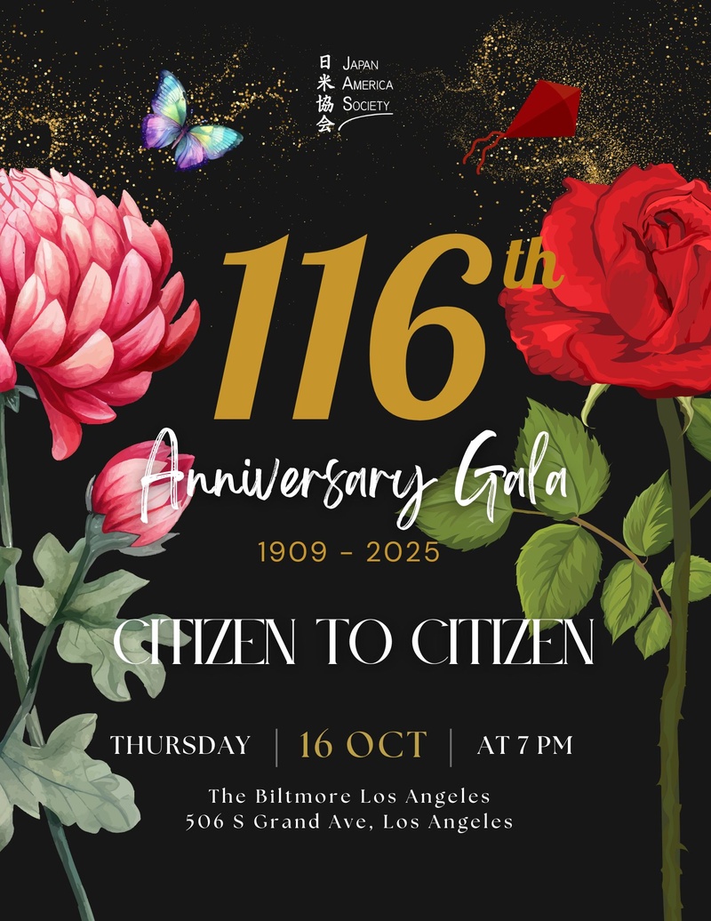 The Japan America Society of Southern California will host its 116th Anniversary Dinner & Gala Celebration on Thursday, October 16, 2025, at the historic Biltmore Los Angeles.