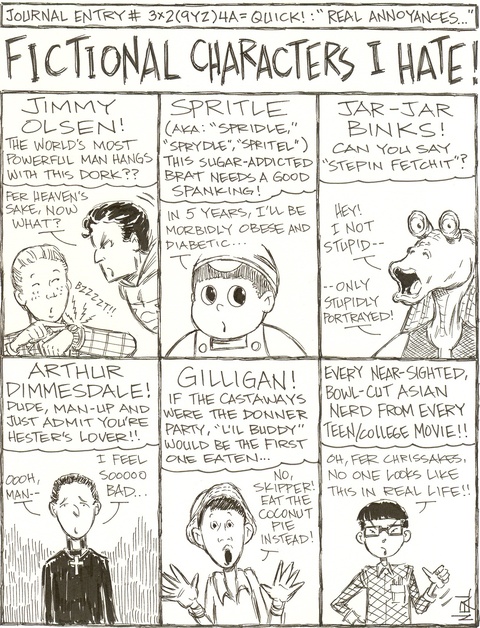 A weekly visual journal/cartoon about an easily-annoyed fourth generation American of Japanese descent. This week, "Fictional characters I hate!"