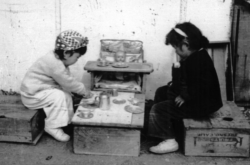 While the bath water heated, the boys played hide-and-seek and kick the can, and the girls served each other leaves and twigs at tea parties served on fruit-crate tables.
