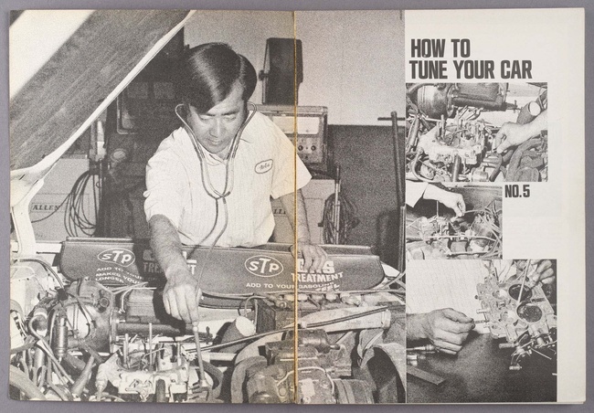 Meanwhile, by coincidence, his Hollywood location was near the then-headquarters of Petersen Publishing, home to many of the most influential auto magazines in the U.S. (Hot Rod, Motor Trend, Lowrider, etc.). Petersen writers and editors would often drop by the Auto Lab: “They just got interested in me… They came with zillions of questions.” Petersen staff ended up doing a photo shoot of Oshiro working on engines and used those images in a series of How To Fix Your Car-type manuals published through the 1970s.