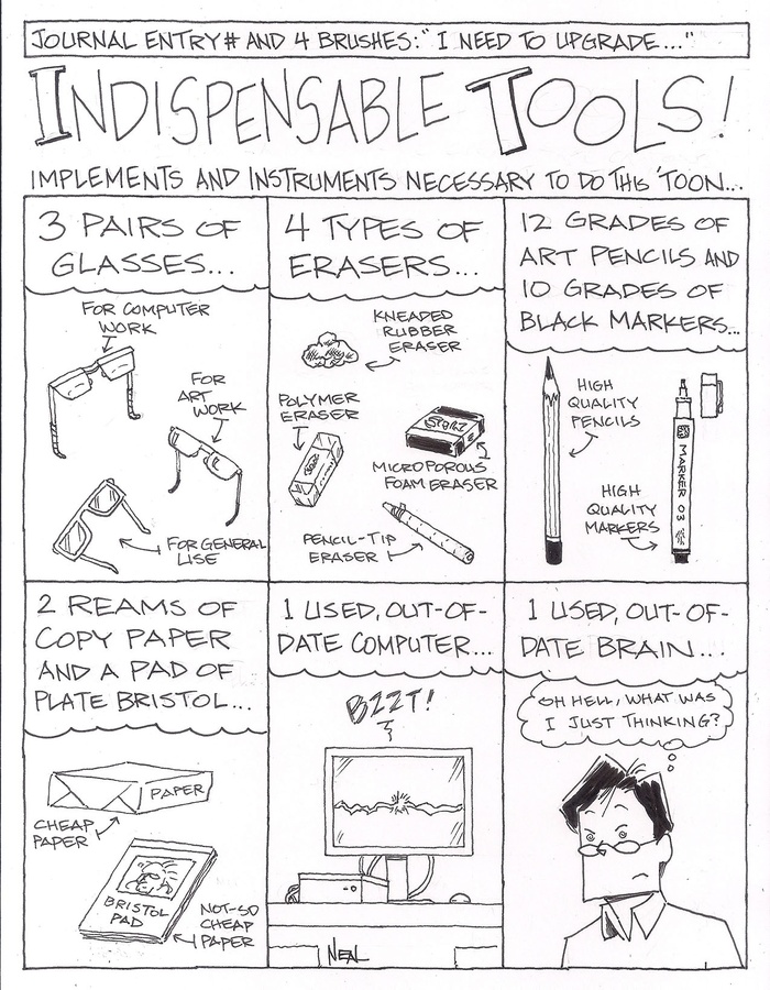 A weekly visual journal/cartoon about an easily-annoyed fourth generation American of Japanese descent. This week, “Indispensable Tools! Implements and instruments necessary to do this ’toon...”