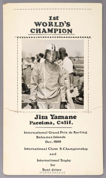 This was post-war Southern California, the hotbed of hot rodding, fertile grounds for automotive innovation. This included Jimmie Yamane, a Nisei from Pacoima, who watched go-karting blossom from its early beginnings in the 1950s. Like many Nikkei who grew up in the San Fernando Valley, he lived and worked on a farm with his family. “I was always interested [in cars] because I was on a farm. That’s all we had. We didn’t have any toys or anything, so anything I could drive with, I learned how to drive tractors, trucks, a Model T Ford.”