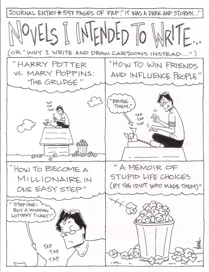 A weekly visual journal/cartoon about an easily-annoyed fourth generation American of Japanese descent. This week, “Novels I Intended to Write... (or ‘why I write and draw cartoons instead...’)”