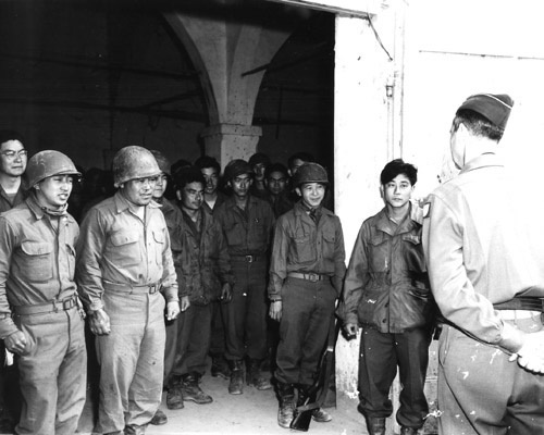 Lucca area, Italy -- Gen. Mark W. Clark, CG of the fifteenth army group (touring the 92nd division area) welcomes the men of the 442nd Regiment, and the 100th Battalion, who are now under his command. General Clark formerly commanded them while he was CG of the fifth army, and they were then with the 34th Division. Fifth Army. 3 April 1945. Photo: U.S. Army photograph