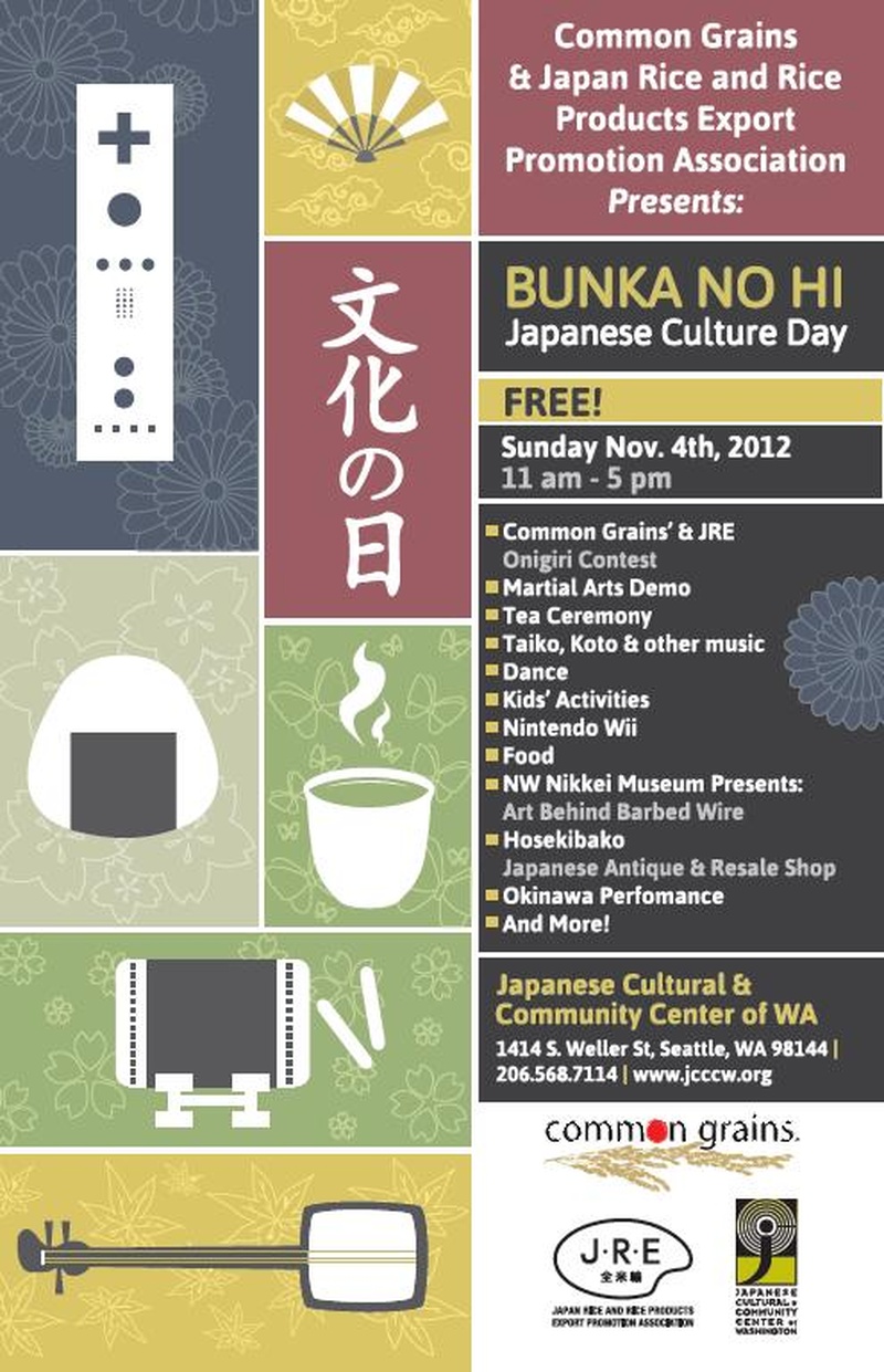 ¡Ven a celebrar la cultura y herencia japonesa y japonesa-estadounidense en el Centro Cultural y Comunitario Japonés de Washington! Este año, Common Grains junto con la Asociación de Promoción de Exportación de Arroz y Productos de Arroz de Japón (JRE) patrocinarán Bunka no Hi, que presenta una gran cantidad de nuevas actividades y cosas divertidas para hacer relacionadas con la cultura japonesa tradicional y moderna: Concurso de elaboración de bolas de arroz Onigiri de Common Grains y JRE Demostraciones de Nintendo Wii U Taller de Minidoka Kamishibai Furoshiki Taller de genealogía del Seattle Go Center Baile Minyo ¡Y mucho más! Además, tenemos vendedores que ofrecen deliciosos dulces y platos principales en el evento: - Camión de comida japonesa Six Coins - Tokyo Dog - Pastelería Setsuko - Umaido Manju Bunka no Hi es un evento gratuito para la comunidad, sin embargo, se cobrará la comida y solo se aceptará efectivo. ¡Hay estacionamiento gratuito disponible alrededor del JCCCW!