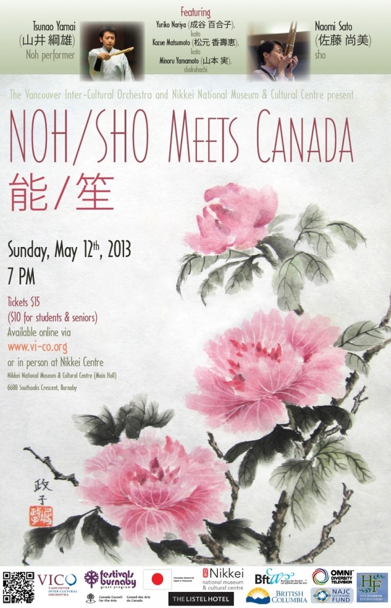 La Orquesta Intercultural de Vancouver y el Museo Nacional y Centro Cultural Nikkei presentan a Tsunao Yamai y Naomi Sato en concierto el domingo 12 de mayo de 2013 a las 7:00 p. m. Museo Nacional y Centro Cultural Nikkei – Sala principal 6688 Southoaks Crescent, Burnaby Entradas $15 ($10 para estudiantes y personas mayores) Disponibles a través de www.vi-co.org o en persona en el Nikkei Centre Un cuarteto compuesto por Naomi Sato (sho) y los músicos japoneses locales Yuriko Nariya (koto), Kozue Matsumoto (koto) y Minoru Yamamoto (shakuhachi) presentarán un concierto de música tradicional japonesa y composiciones japonesas/canadienses contemporáneas. En este evento, el VICO tiene el honor de recibir al mundialmente conocido intérprete de Noh Tsunao Yamai, que se presentará en Vancouver como parte de su gira “Noh Meets Canada” (producida por el Consulado General de Japón en Vancouver con el apoyo de la Agencia de Asuntos Culturales del Gobierno de Japón). Se trata de una oportunidad única de ver una actuación íntima de uno de los intérpretes y líderes más respetados de Japón en esta antigua y profunda forma de expresión teatral. Además de una actuación del Sr. Yamai y su conjunto, el programa incluirá música tradicional para sho solo, koto y shakuhachi; un dúo para dos koto de Tadao Sayai titulado Tsuchi Ningyo; Chidori No Kyoku del compositor japonés del siglo XIX Kengyo Yoshizawa (en un nuevo arreglo de Mark Armanini para dos koto, sho y shakuhachi); y, por acuerdo especial, una colaboración entre todos los artistas participantes (entre ellos, la Sra. Sato, el Sr. Yamai y un conjunto tradicional de 8 piezas).
