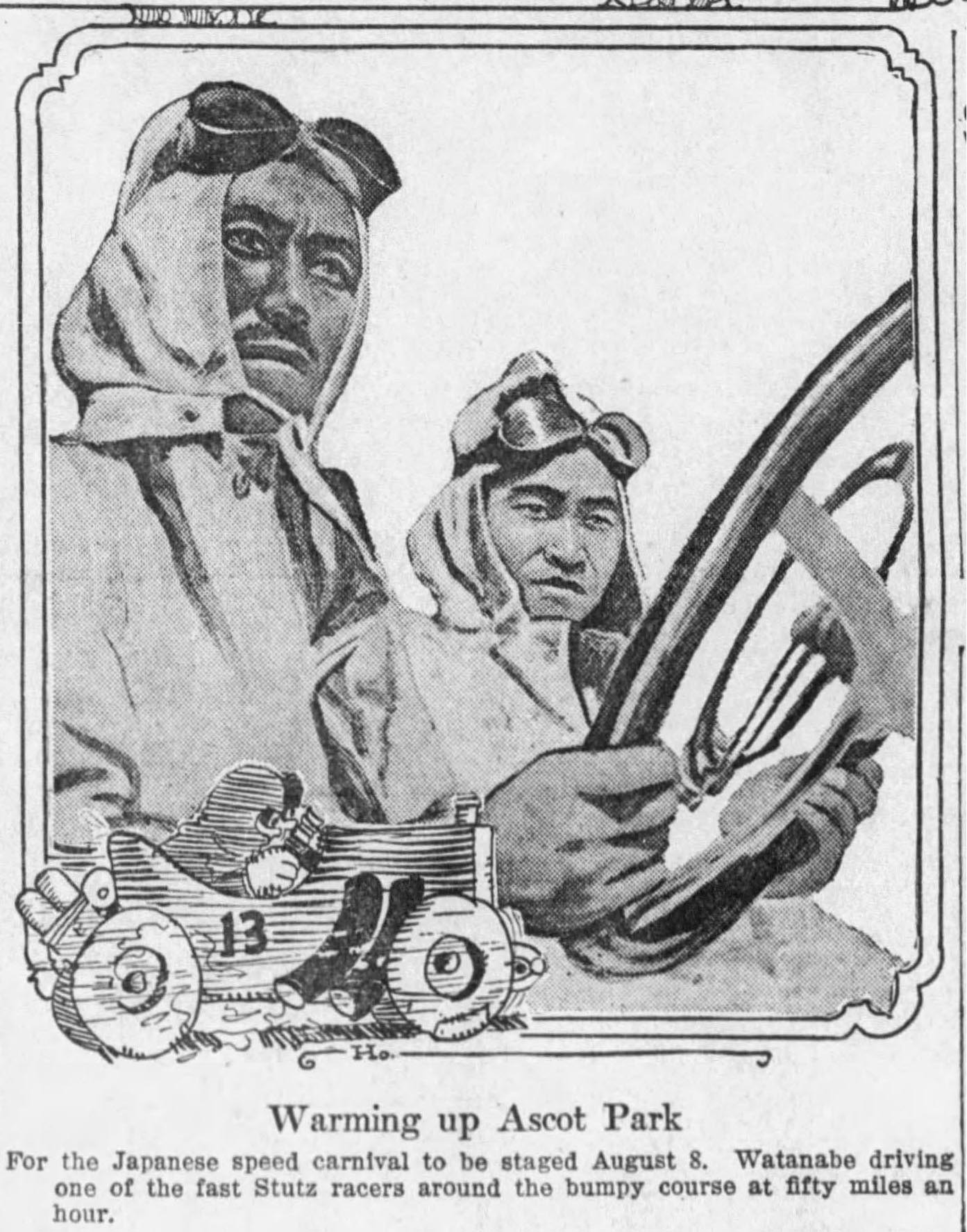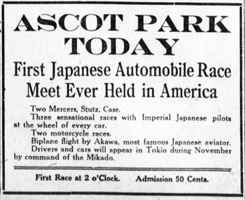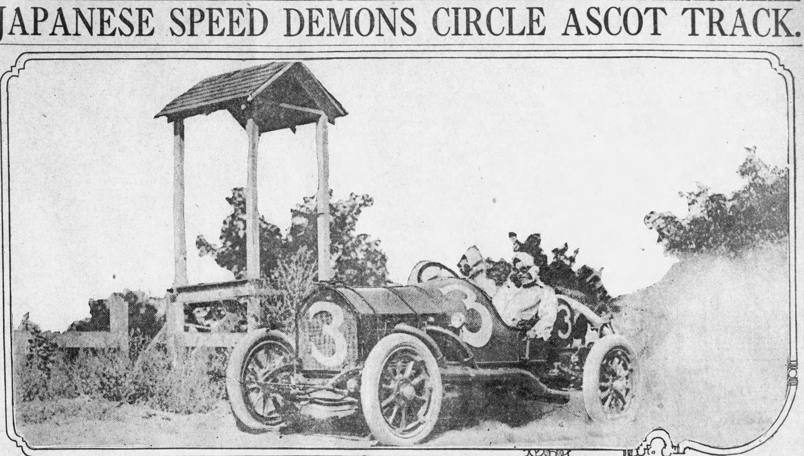 1. Si bien la carrera del 8 de agosto de 1915 en Ascot Park pudo haber sido el primer evento organizado con un equipo de corredores de automóviles de ascendencia japonesa, mi colega Genevieve Carpio ha escrito sobre carreras ciclistas japonesas-estadounidenses celebradas al menos diez años antes en Riverside. Es lógico que hubiera corredores de automóviles Nikkei participando en eventos antes del 8 de agosto de 1915, pero no se promocionaron de la misma manera que este evento de Ascot.