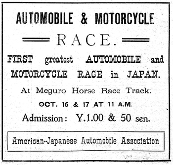 El primero de estos eventos, que marcó la primera carrera automovilística registrada en Japón, se celebró los días 16 y 17 de octubre en el Hipódromo de Meguro, un hipódromo ubicado entonces a menos de una milla al sur del actual Nakameguro. 9 Descrita como "Jidosha Daikyousōkai" (la Gran Carrera Automovilística), a diferencia de su anterior evento hermano, Ascot, la carrera de octubre se consideró una decepción, con solo 1000 asistentes. Irónicamente, parte de la baja participación pudo deberse a la falta de familiaridad del público japonés con las carreras de autos.