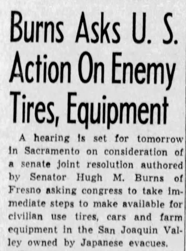 6. “Burns pide a EE.UU. que tome medidas respecto a neumáticos y equipos enemigos”, The Fresno Bee , 28 de marzo de 1943, pág. 1.