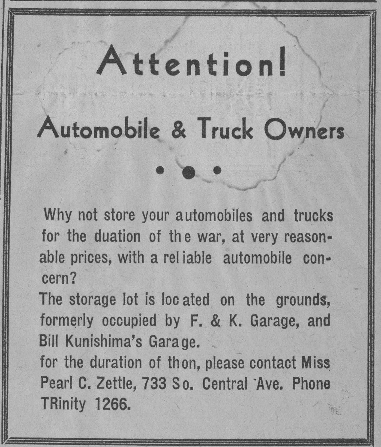 En abril de 1943, los políticos de California presentaron proyectos de ley para permitir al gobierno reclamar “maquinaria almacenada por evacuados japoneses bajo el procedimiento de dominio eminente”. 9 Si bien no hay evidencia de que estos proyectos de ley hayan tenido éxito, su mero intento sugiere cuán serias eran ciertas facciones de la Costa Oeste respecto de privar a la comunidad japonesa estadounidense de sus bienes, incluidos sus automóviles.