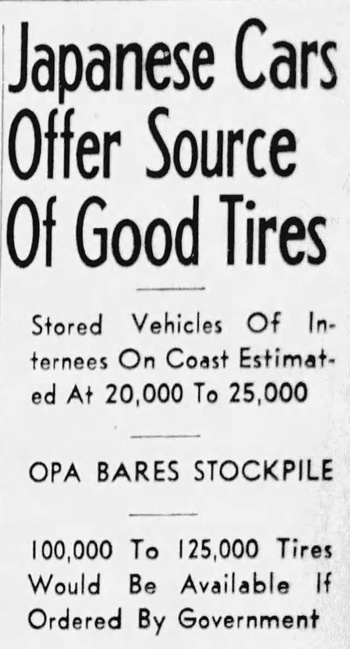 Si el sentimiento antijaponés no era suficientemente claro, al día siguiente, otro artículo del Servicio McClatchy detrás del Fresno Bee y otros periódicos dejó las cosas más claras, citando a un portavoz anónimo de la WRA que afirmaba que "los japoneses" poseían una "actitud de deslealtad... al no desear ver sus automóviles utilizados de ninguna manera para contribuir a una victoria de las Naciones Unidas en la guerra". 5