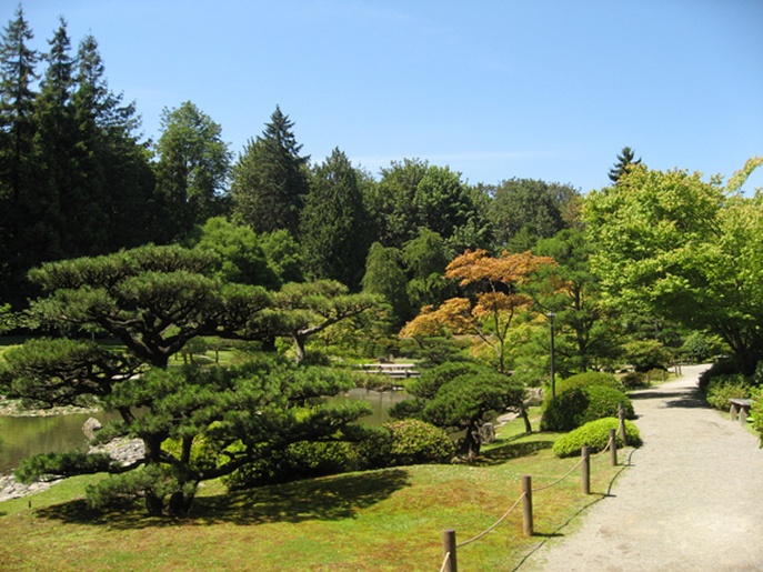 La Fundación eligió a Juki Iida para diseñar el jardín, diseñador y constructor de más de 1.000 jardines japoneses en todo el mundo. Trabajando con otros seis diseñadores conocidos, entre ellos K. Inoshita, Iida produjo 34 páginas de planos que describen sus planes para el jardín de 3-1/2 acres. Mientras camina por el sendero, esta es la vista al caminar desde la entrada principal hacia el lago. -- Este es el jardín japonés en el Washington Park Arboretum. La foto muestra la vista al caminar desde la entrada principal hacia el lago. Fue tomada el 11 de julio de 2007. Jardín japonés de Seattle en el Washington Park Arboretum 1075 Lake Washington Boulevard East North of East Madison Street 206.684.4725 Obtenga más información sobre el jardín en línea >>