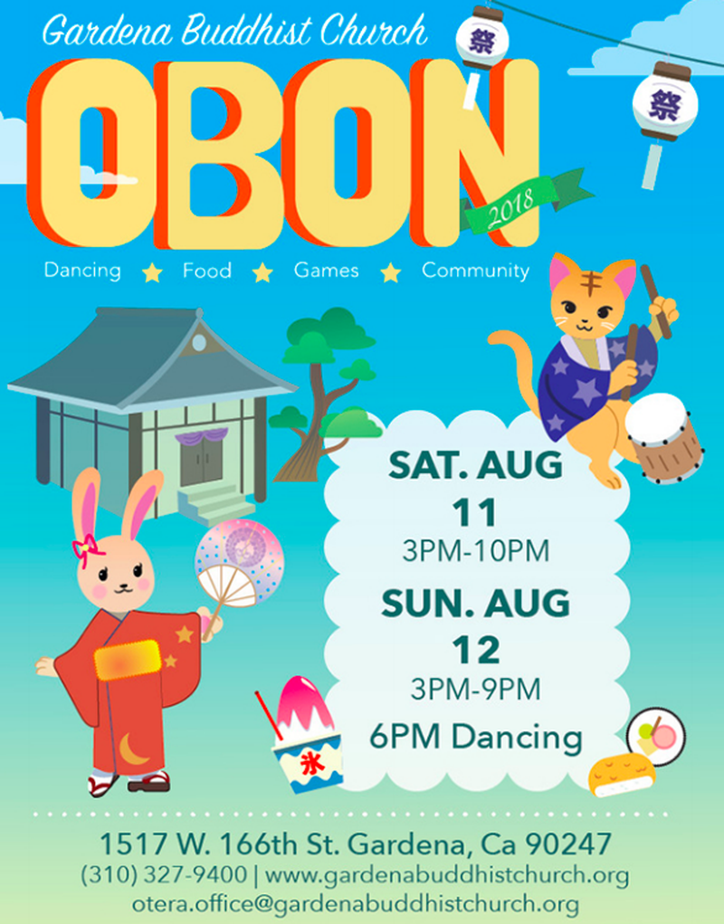 盆祭りは夏に行われ、生と死、そしてコミュニティを祝います。盆祭りは日本文化の重要な部分であり、通常、踊り、太鼓、食べ物、ゲームなどが含まれます。家族で楽しめる素晴らしいイベントです。土曜日: 午後 3:00 - 午後 10:00 日曜日: 午後 3:00 - 午後 9:00午後 6:00 踊り 詳細については、ガーデナ仏教教会のWeb サイトをご覧ください。