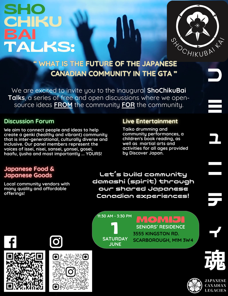私たちは、コミュニティからコミュニティのためにアイデアをオープンソース化する自由でオープンなディスカッションシリーズである、松竹梅会の初講演会を開催できることを嬉しく思います。私たちは人々とアイデアを結びつけ、世代を超えて文化的に多様で包括的な元気なコミュニティを作りたいと考えています。私たちのパネリストは、一世、二世、三世、四世、五世、ハーフ、移住者からの声で構成され、「GTAのJCコミュニティの将来はどうなるのか?」について話し合います。この無料イベントに登録するには: https://www.eventbrite.ca/e/shochikubai-talks-what-is-the-future-of-the-japanese-canadian-community-in-the-greater-toronto-are-tickets-890491984497 ?aff=oddtdtcreator 詳細については、 https ://www.facebook.com/profile.php?id=61557977972914&mibextid=ZbWKwL https://www.instagram.com/shochikubaikai/をご覧ください。私たちは、日系カナダ人遺族協会のコミュニティ基金からの支援に感謝しています。
