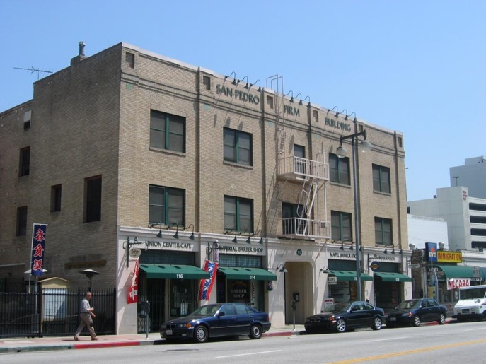 ロサンゼルスのリトル トーキョー歴史地区にあるサン ペドロ ファーム ビル。 -- サン ペドロ ファーム ビルは、リトル トーキョー歴史地区の西端、ジャッジ ジョン アイソ ストリートにあります。この通りは、以前はファースト ストリートの北にあるサン ペドロ ストリートの一部でした。現在は、リトル トーキョー サービス センター コミュニティ開発公社によって維持管理されている、低価格住宅といくつかの店舗になっています。ビルの左下のユニットを占める東京カフェは、街で最高のチャーシューを提供しています。ランチのチャーシューとシューマイの組み合わせは、非常に満足できる日系アメリカ人の食事です。