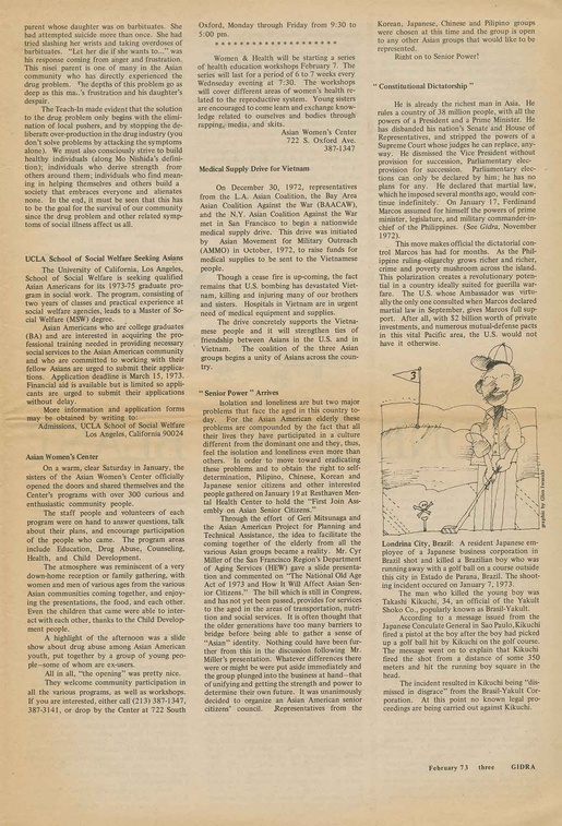3 ページ目はGIDRA (1973 年 2 月号) からスキャンしたものです。GIDRA「アジア系アメリカ人運動の声」を自称する月刊誌です。カリフォルニア大学ロサンゼルス校 (UCLA) の学生によって 1969 年 4 月に創刊されたこの雑誌は、急進的な進歩主義の政治的立場を掲げ、主流メディアでは他には見られない運動に関する情報を提供していました。カレン・イシヅカのコレクション