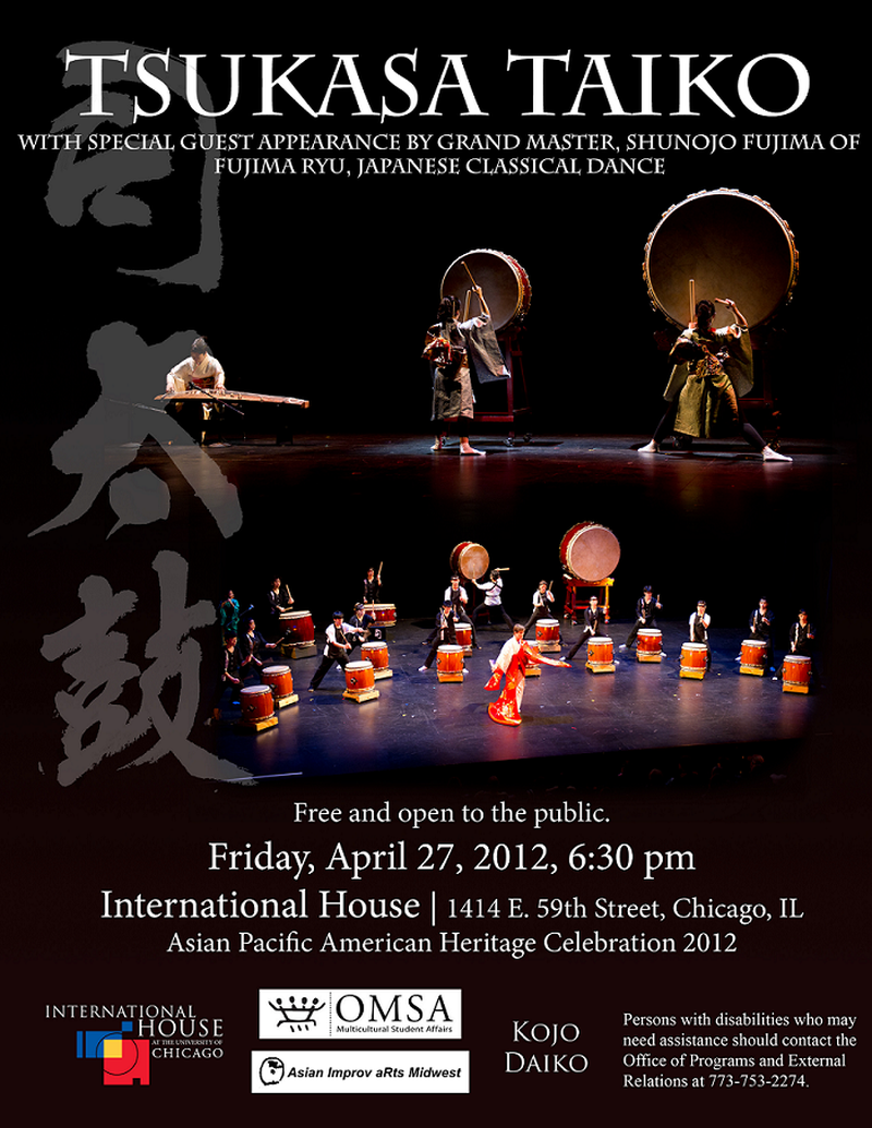 Global Voices Performing Arts apresenta Tsukasa Taiko com participação especial do Grande Mestre Shunojo Fujima de Fujima Ryu, dança clássica japonesa. Celebrando a herança asiático-pacífica-americana na Internation House da Universidade de Chicago. Gratuito e aberto ao público.