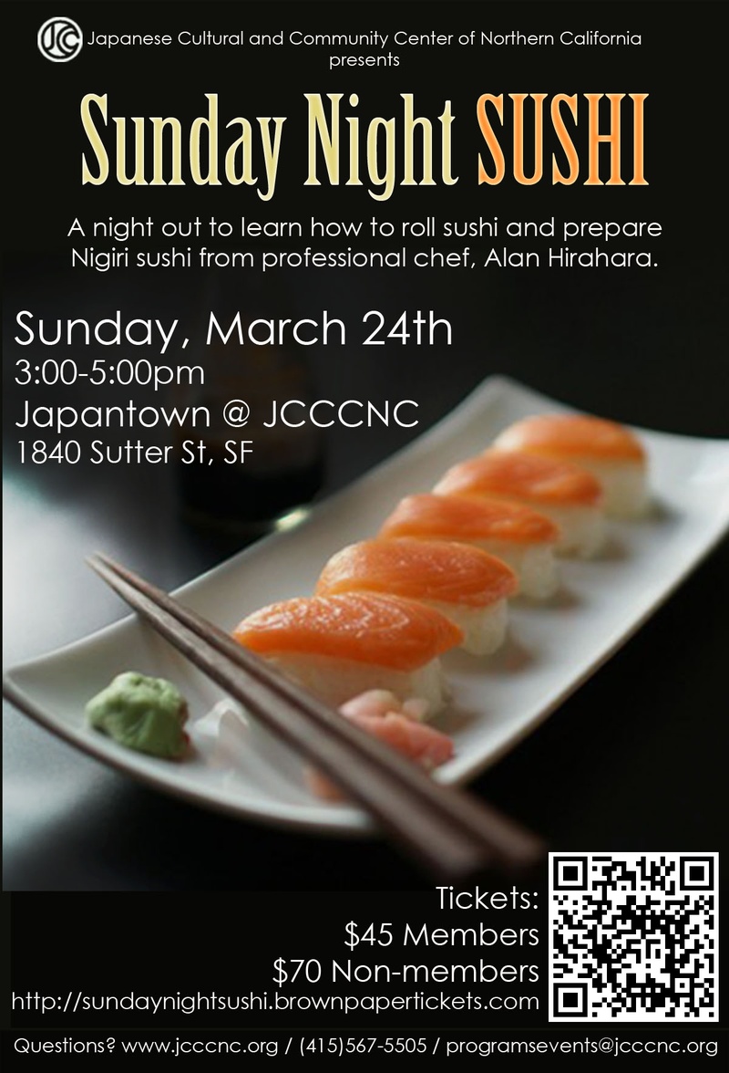 Sushi de domingo à noite No domingo, 24 de março de 2013, o Japanese Cultural and Community Center of Northern California oferecerá aos indivíduos a chance de dominar a arte de fazer sushi em seu workshop de Sushi de Domingo à Noite. Ministrado pelo Chef Alan Hirahara, este workshop prático ensinará aos alunos técnicas básicas de fazer sushi usando os ingredientes mais frescos, dando a eles a base adequada para explorar melhor a arte em casa com a família e os amigos. O que está incluído: Como preparar arroz de sushi Como fatiar corretamente peixe fresco para sushi Preparação prática de sushi e degustação de sushi caseiro, que inclui: Hosomaki roll (arroz por dentro); Uramaki roll (arroz por fora); e Nigiri sushi. Os participantes também terão a chance de explorar sua criatividade com um "crie seu próprio roll" no final. Todas as receitas serão fornecidas no final da aula O Chef: O Chef Alan Hirahara é graduado pela California Culinary Academy. O Chef Alan passou 12 anos no bar de sushi Shogun em Mammoth Lakes, Califórnia, trabalhando até se tornar chefe de sushi. Desde 2001, ele tem administrado seu próprio negócio de buffet de sushi e também é instrutor de Sushi 101 na renomada Draeger's Cooking School. Ganhe US$ 15 de desconto na admissão geral registrando-se antes de 10 de março! Basta inserir o código promocional: SushiFunday Para ingressos: http://sundaynightsushi.brownpapertickets.com/