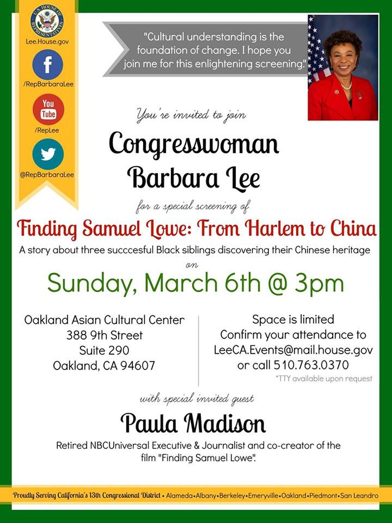 Você está convidado a se juntar à congressista Barbara Lee e ao Oakland Asian Cultural Center para uma exibição especial de "Finding Samuel Lowe: From Harlem to China", uma história sobre três irmãos negros bem-sucedidos descobrindo sua herança chinesa. Temos uma convidada especial, Paula Madison, executiva aposentada da NBC Universal, jornalista e cocriadora do filme "Finding Samuel Lowe". Quando: domingo, 6 de março às 15h Onde: Oakland Asian Cultural Center 388 9th Street, Suite 290, Oakland, CA 94607 O espaço é limitado. Confirme sua presença com LeeCA.Events@mail.house.gov ou ligue para 510-763-0370