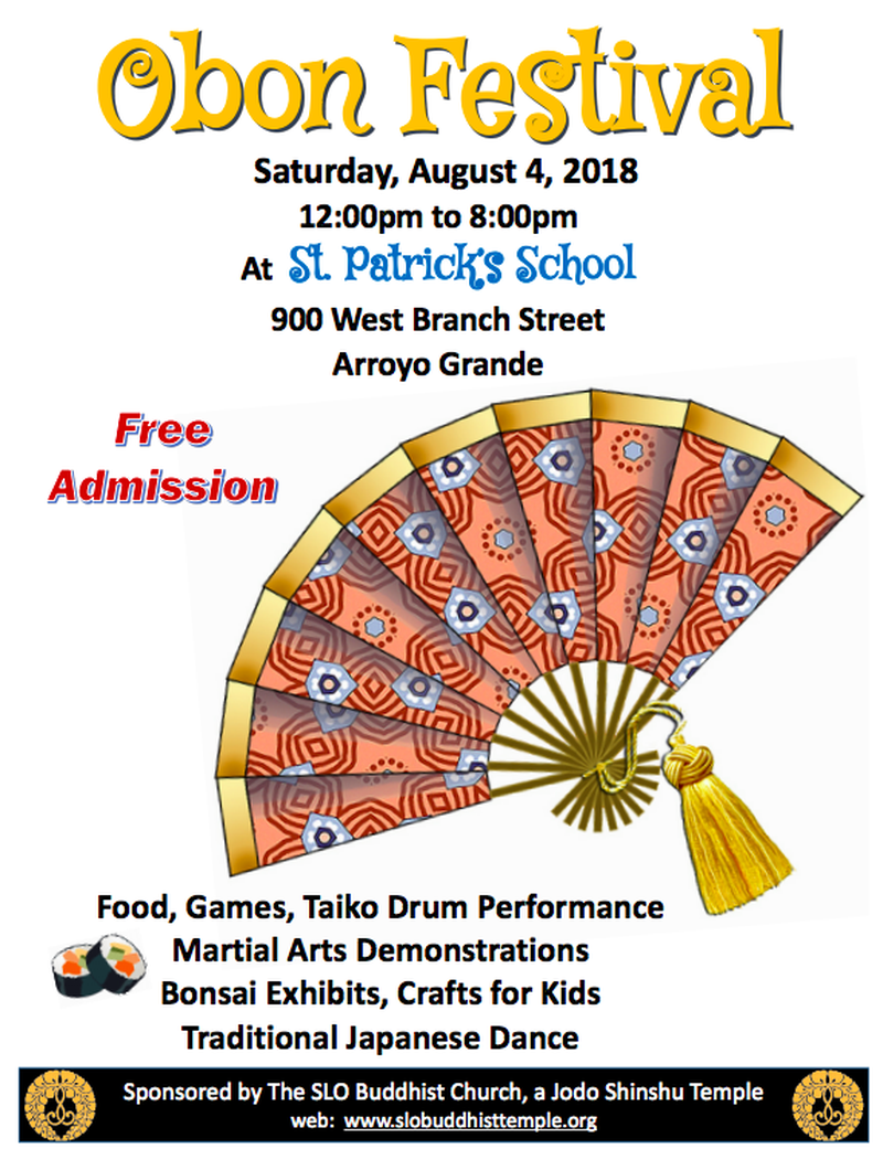Os festivais de Obon acontecem durante o verão e celebram a vida, a morte e a comunidade. É uma parte importante da cultura japonesa e normalmente inclui dança, taiko, comida, jogos e muito mais. É um ótimo evento familiar. Visite o site do Templo Budista de San Luis Obispo para obter mais informações.
