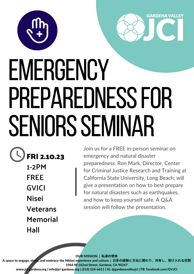 Junte-se a nós para um seminário presencial GRATUITO sobre preparação para emergências para idosos. Ron Mark, Diretor do Centro de Pesquisa e Treinamento em Justiça Criminal da Universidade Estadual da Califórnia, Long Beach, fará uma apresentação sobre como se preparar melhor para desastres naturais, como terremotos, e como se manter seguro. Uma sessão de perguntas e respostas seguirá a apresentação. Para se registrar, visite o site do GVJCI ou ligue para (310) 324-6611. https://www.jci-gardena.org/gvjci-upcoming-events.html
