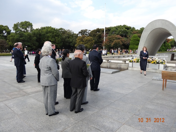 Apresentação de flores no Cenotáfio Memorial no Parque Memorial da Paz de Hiroshima